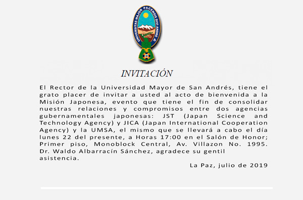 El Rector de la Universidad Mayor de San Andrés, tiene el grato placer de invitar a usted al acto de bienvenida a la Misión Japonesa, evento que tiene el fin de consolidar nuestras relaciones y compromisos entre dos agencias gubernamentales japonesas: JST (Japan Science and Technology Agency) y JICA (Japan International Cooperation Agency) y la UMSA, el mismo que se llevará a cabo el día lunes 22 del presente, a Horas 17:00 en el Salón de Honor; Primer piso, Monoblock Central, Av. Villazon No. 1995.