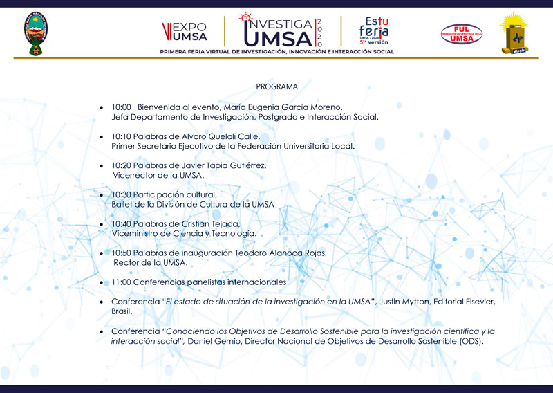 🔴🔵 INVITACIÓN & PROGRAMA “1ERA FERIA VIRTUAL DE INVESTIGACIÓN, INNOVACIÓN E INTERACCIÓN SOCIAL - INVESTIGA UMSA 2020” ✅ del 21 al 25 septiembre 🗓️