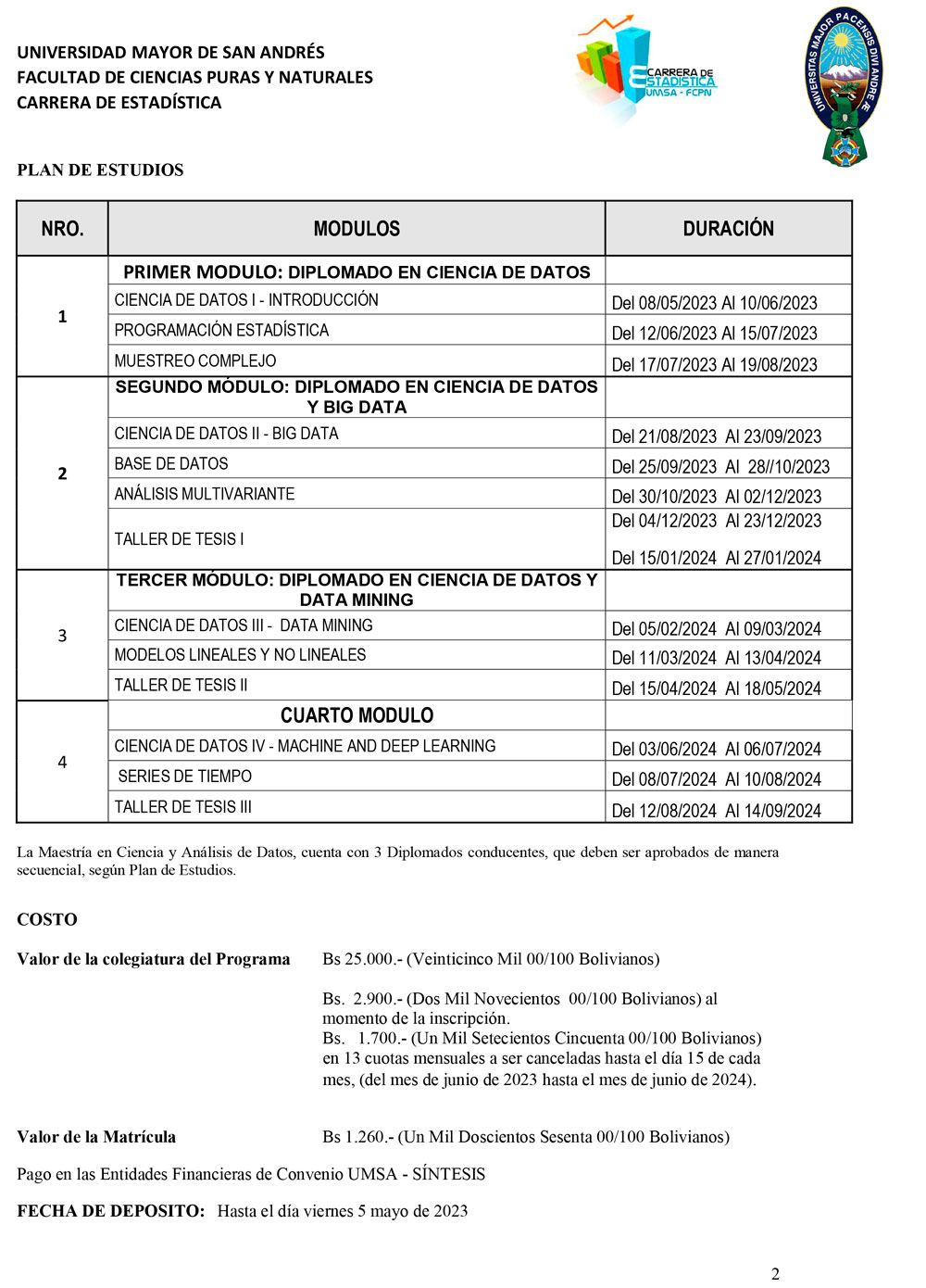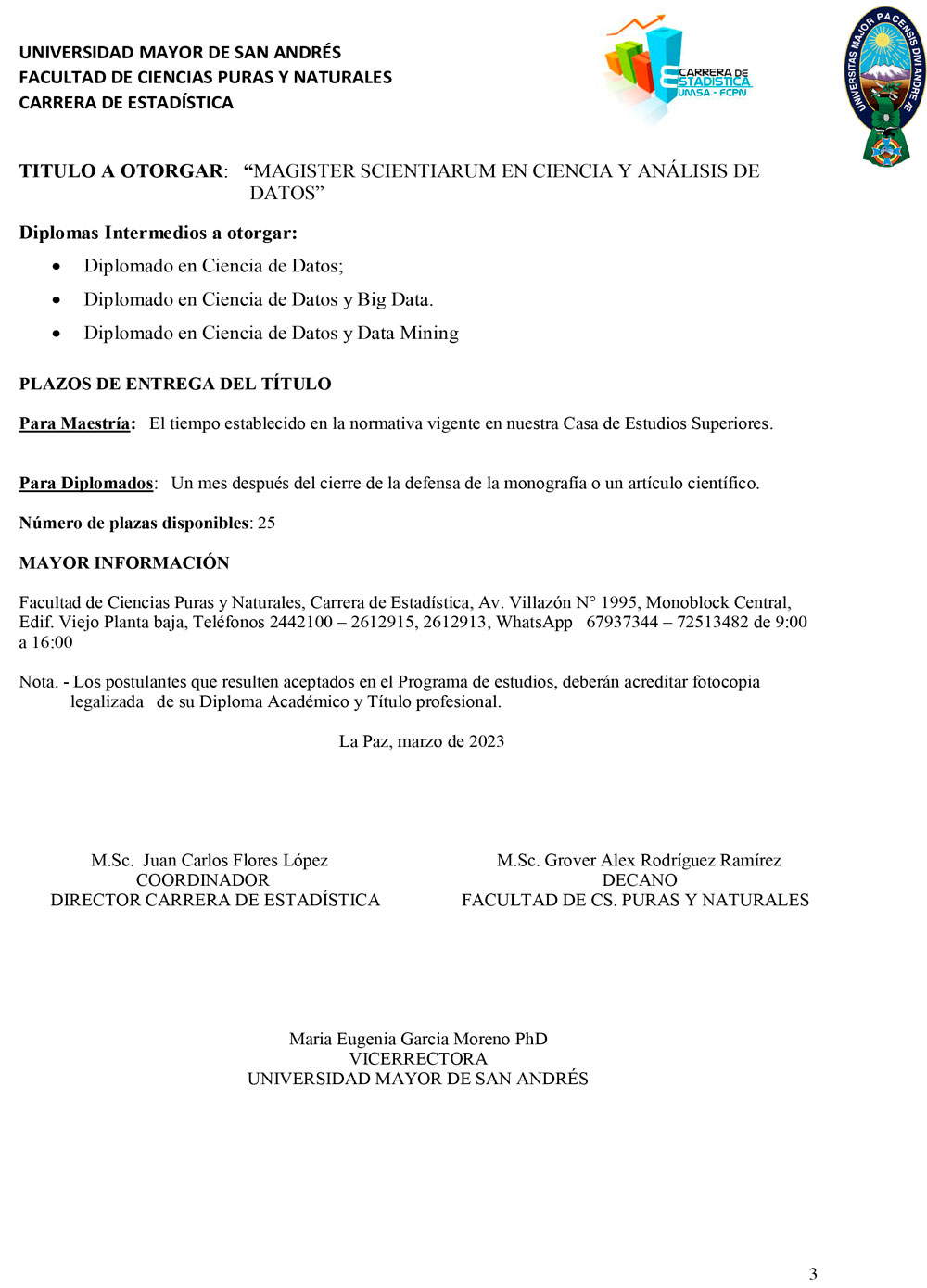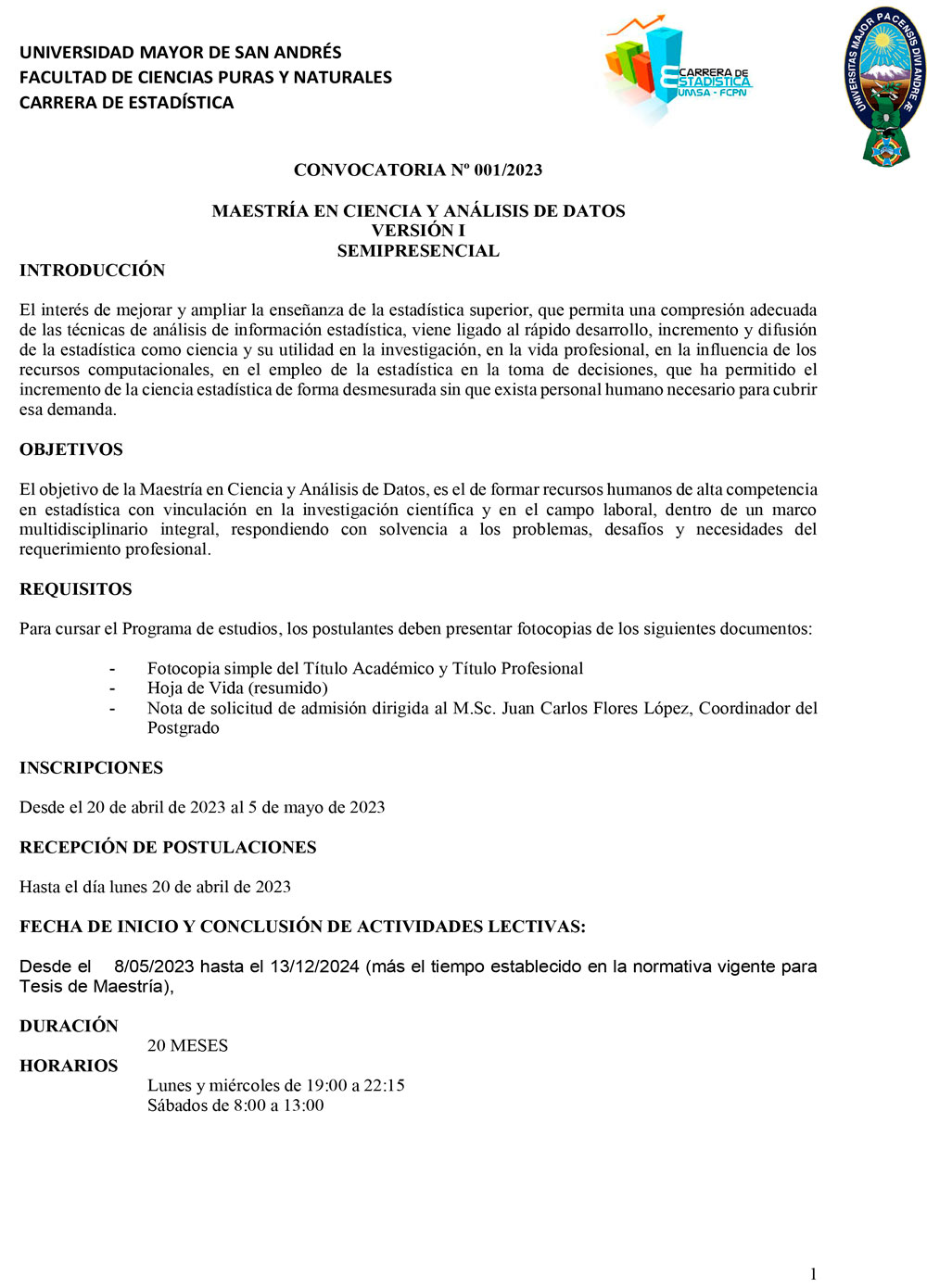 La Carrera de Estadística, de la Facultad de Ciencias Puras y Naturales  de la #UMSA invita a profesionales a cursar la Maestría: