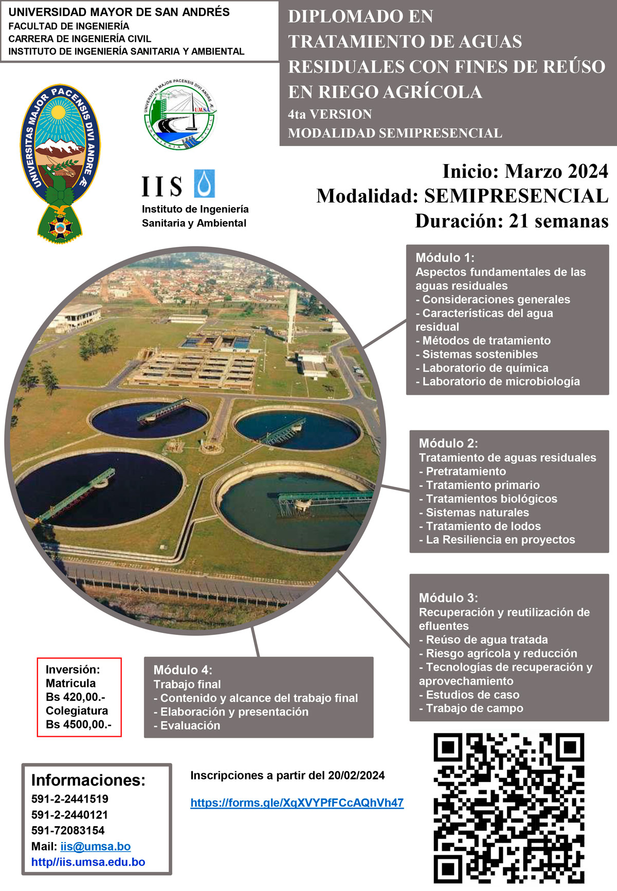 El Instituto de Ingeniería Sanitaria y Ambiental, carrera de Ingeniería Civil, de la Facultad de Ingeniería de la #UMSA invita a profesionales a cursar el Diplomado en: